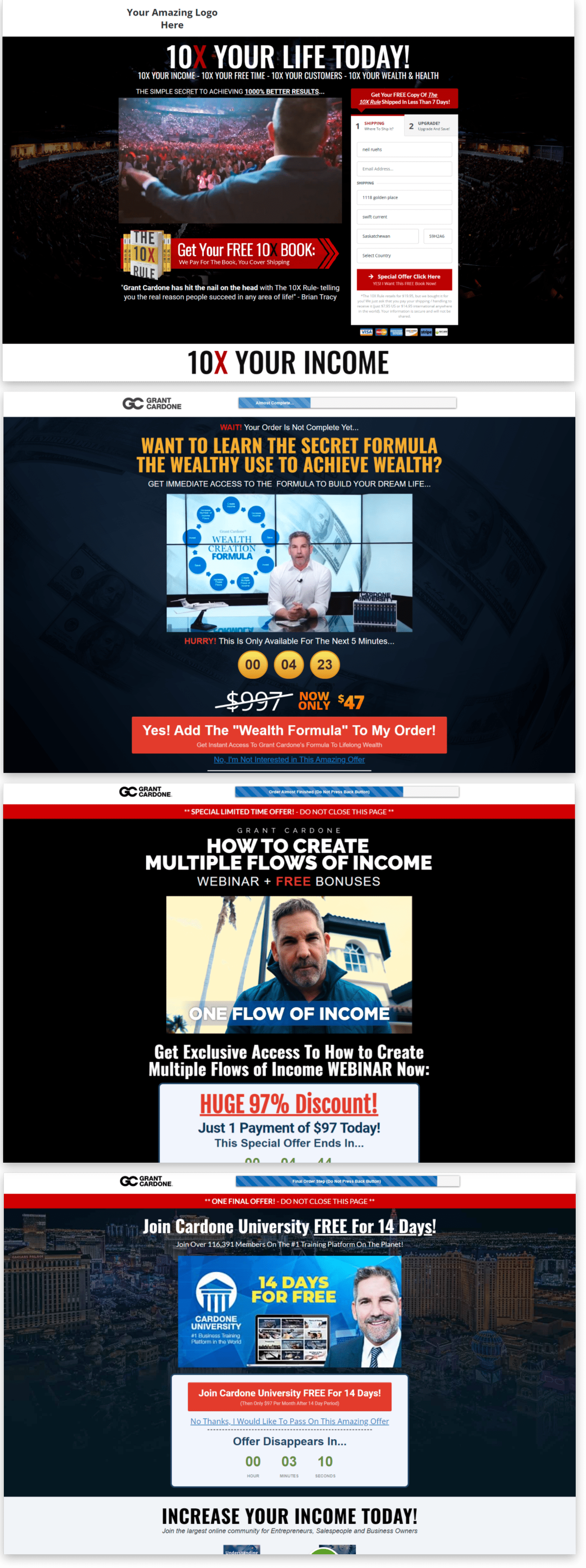 Grant Cardone 10X Book Funnel Optin, OTO1, OTO2, Downsell and Thankyou Page
